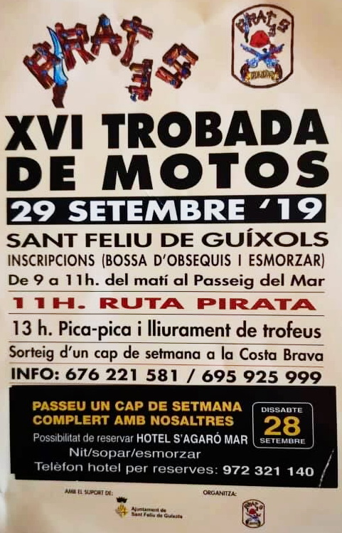 El grup motard Pirates organitza la 16a edició de la seva consolidada trobada de motos. Tindrà lloc el 29 de setembre al passeig del Mar de Sant Feliu de Guíxols, de 9 a 11 del matí.