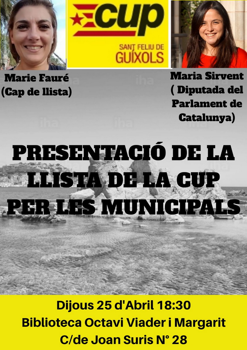 Demà dijous 25 d’Abril, CUP Guíxols presentarà la seva llista de cara a les eleccions municipals que se celebraran a la ciutat el proper 26 de maig. L’acte tindrà lloc a la Biblioteca Pública Octavi Viader i Margarit a partir de les 18.30 hores.