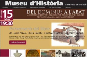 Aquest divendres, 15 de març, a les 19:30 h. a la sala Abat Panyellas del Museu d’Història, es presentarà el llibre “Del Dominus a l’Abat. La història a l’entorn del monestir de Sant Feliu de Guíxols. De l’època romana a la desamortització”, de Jordi Vivo, Lluís Palahí, Gustau Garcia i Antoni Prados, tots ells membres o col·laboradors del Laboratori d’Arqueologia i Prehistòria de l’Institut de Recerca Històrica (IRH-UdG), analitza la història i evolució del monestir guixolenc a la llum dels resultats de les darreres excavacions arqueològiques desenvolupades pel Laboratori d’Arqueologia i Prehistòria de la Universitat de Girona i el Museu d’Història de Sant Feliu.
