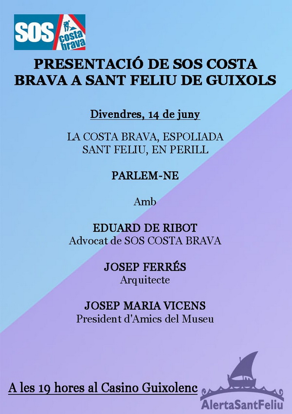 Una trentena d’entitats de perfil ecologista es van constituir encara no fa un any per defensar el territori en contra d’aquesta destrucció del medi natural. És la plataforma SOS Costa Brava, que demà divendres es presenta a Sant Feliu de Guíxols a la 19h. Al Casino Guixolenc, al passeig del Mar. Sota el títol de La Costa Brava, espoliada Sant Feliu, en perill. Intervindran Eduard de Ribot, advocat i activista de SOS Costa Brava, l’arquitecte Josep Ferrés i el president dels amics dels museu de Sant Feliu de Guíxols, Josep Maria Vicens.