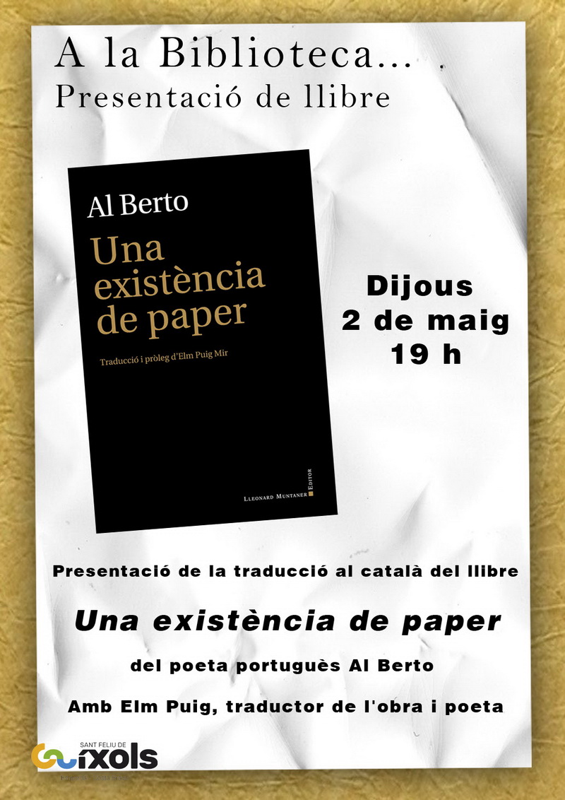 El proper dijous 2 de maig a les 7 de la tarda a la Biblioteca Pública Octavi Viader i Margarit, tindrà lloc la presentació del llibre Una existència de paper d’Al Berto.