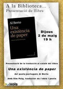El proper dijous 2 de maig a les 7 de la tarda a la Biblioteca Pública Octavi Viader i Margarit, tindrà lloc la presentació del llibre Una existència de paper d’Al Berto.