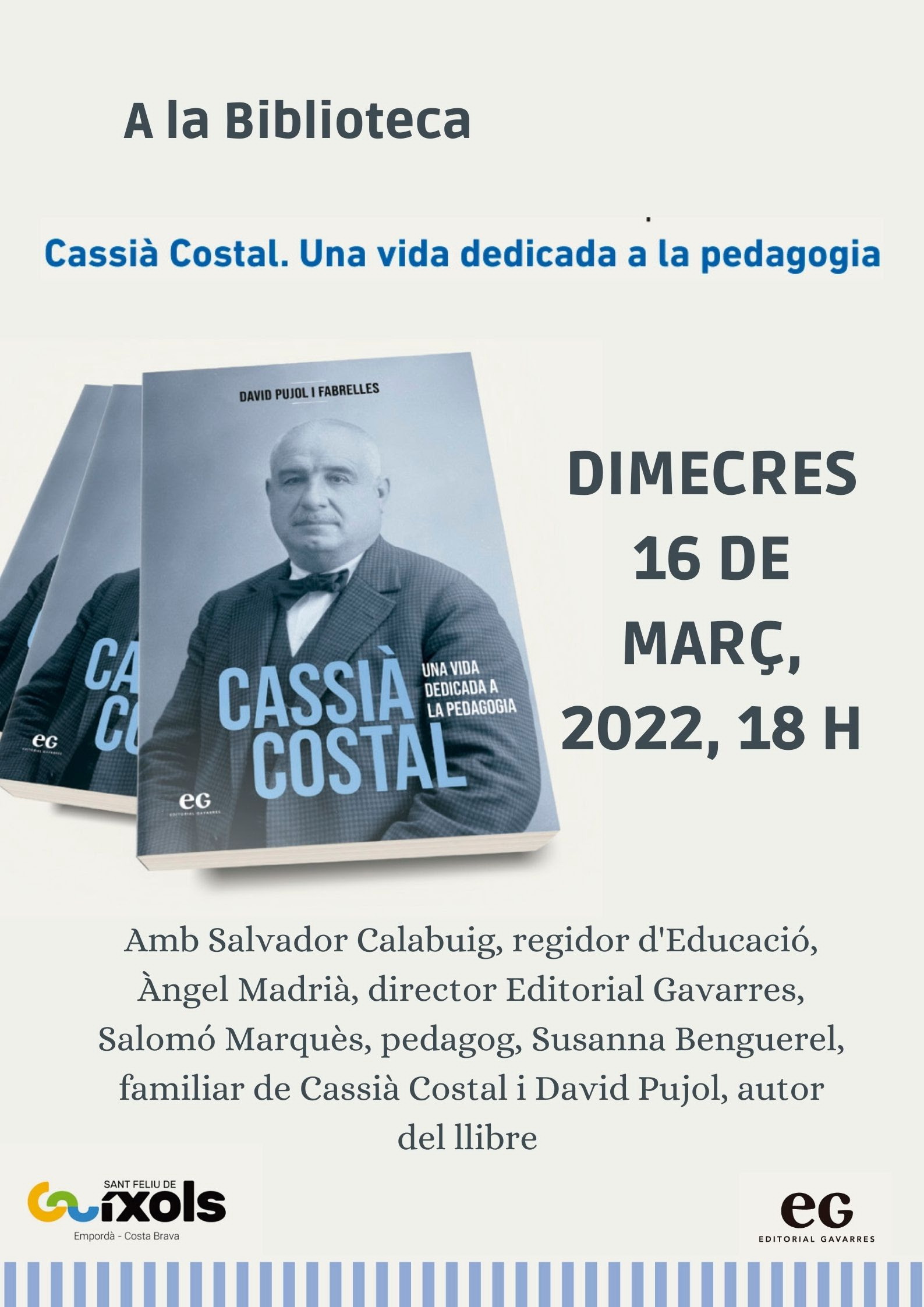 El proper dimecres dia 16 de març a les 6 de la tarda a la Biblioteca Pública Octavi Viader i Margarit de Sant Feliu de Guíxols es farà la presentació del llibre de David Pujol i Fabrelles ‘Cassià Costal. Una vida dedicada a la pedagogia’.