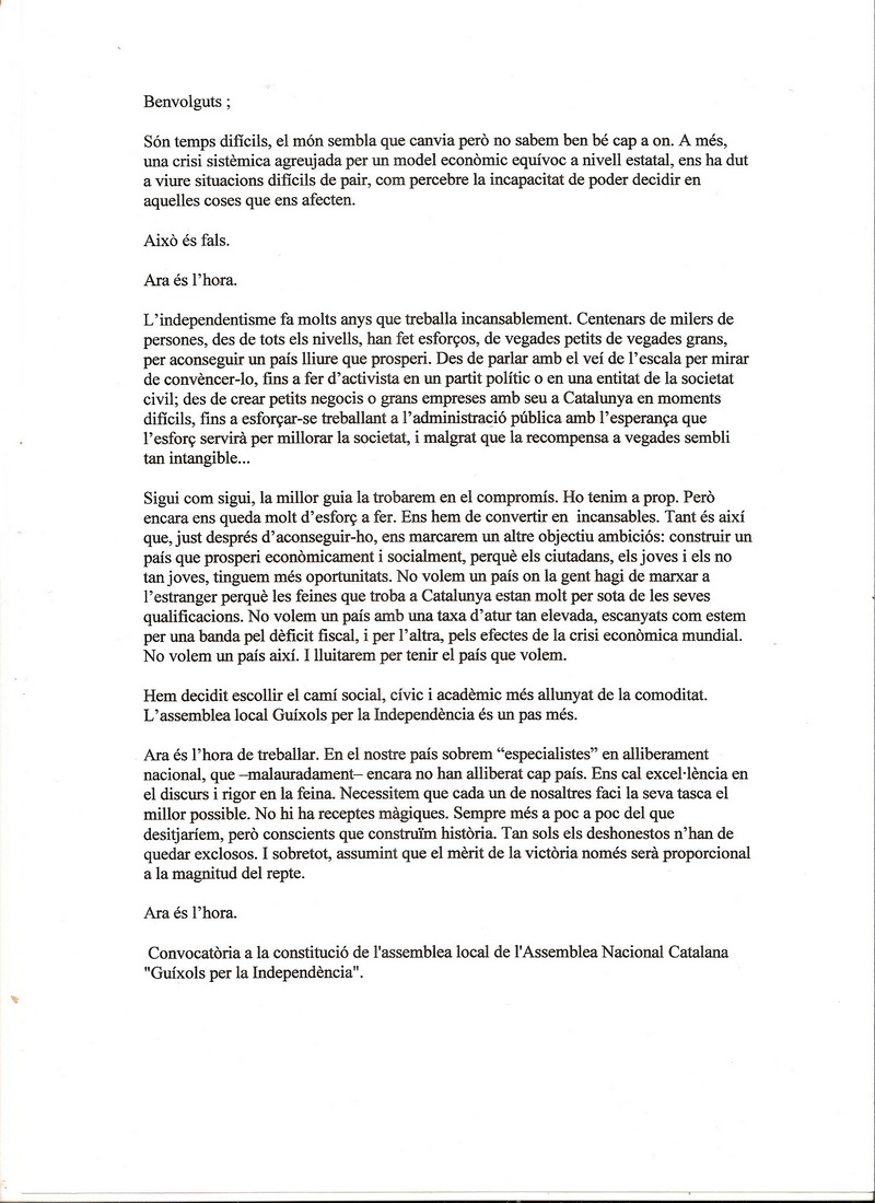 Diferents municipis del país s’estan organitzant en assemblees locals per a la creació de l’Assemblea Nacional Catalana, una assemblea de caràcter cívic, social i unitari amb la voluntat d’aplegar totes les persones que desitgen un estat propi i que veurà la llum al proper novembre.
