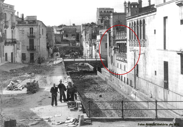 “L’any 1900 Teresa Jordà, vídua Matas, va demanar permís a l’Ajuntament per a reformar una casa de la seva propietat situada als números 6 i 7 de la plaça del Mercat, aleshores anomenada plaça de la Constitució. Aquesta casa comunicava per la part posterior a la riera del Monestir, que es va tapar la dècada de 1930 i actualment correspon a l’avinguda Juli Garreta. En aquesta cara posterior de l’edifici s’hi trobava el pati, al qual es va donar l’aspecte que encara té avui dia, format per una façana amb columnes. Els plànols foren dibuixats pel mestre d’obres Francesc Salvat, que projectà una cuina a la banda esquerra de la columnata, i una habitació per a bany a l’altre costat. No sabem per quin motiu, però, un any més tard, el 1901, es feren uns nous plànols de reforma, iguals als de Salvat però de línies més curoses, realitzats per l’arquitecte Modest Deu Estrada; el projecte de Modest Deu, doncs, fou el que se seguí per a executar l’obra.