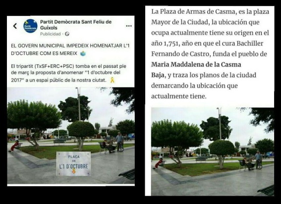 Tanmateix, a ERC Guíxols ens estimem tant la nostra ciutat q coneixem tots els racons, places, avingudes i carrers. Ara bé, resulta que a CiU Guíxols li és igual, li és indiferent, i per fer un post publicitat a Facebook agafen qualsevol plaça de qualsevol racó del món (en aquest cas la Plaza de Armas de Casma al Perú). Així voleu “denunciar” que nosaltres no volem un espai públic de la nostra ciutat? Tot plegat resulta cínic i lamentable”.