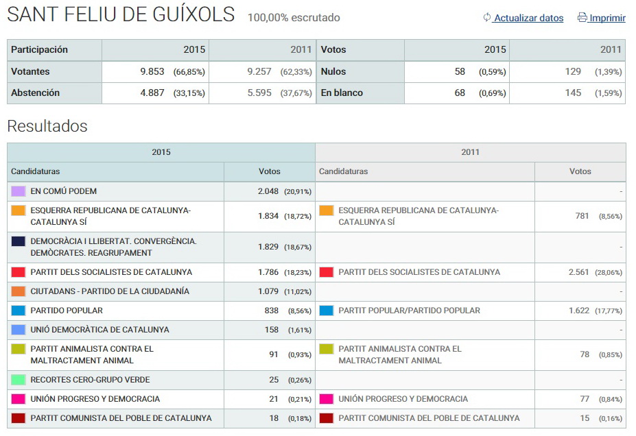En Comú podem s’ha imposat a Sant Feliu de Guíxols en les eleccions d’aquest diumenge els resultats definitius de les quals us oferim en el gràfic: