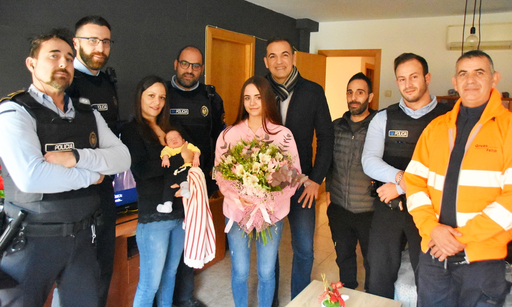 La noia que va donar a llum a un nadó al carrer el passat 19 de novembre, atesa per quatre policies locals, va rebre ahir 18 de desembre la visita dels quatre agents i l’alcalde de Sant Feliu de Guíxols, Carles Motas. Li van portar un ram de flors per a ella i en Jan, el nen que va sortir al portal d’aquesta guixolenca mentre esperaven l’ambulància.