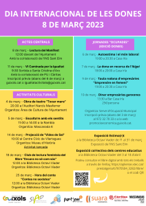 Aquest 8 de març se celebra el Dia Internacional de les Dones, que portarà fins a Sant Feliu diverses activitats. Pel que fa al mateix dia 8, a les 12 del migdia davant l’Ajuntament es farà la tradicional lectura del manifest, que comptarà amb la col.laboració d’alumnat de l’INS Sant Elm.