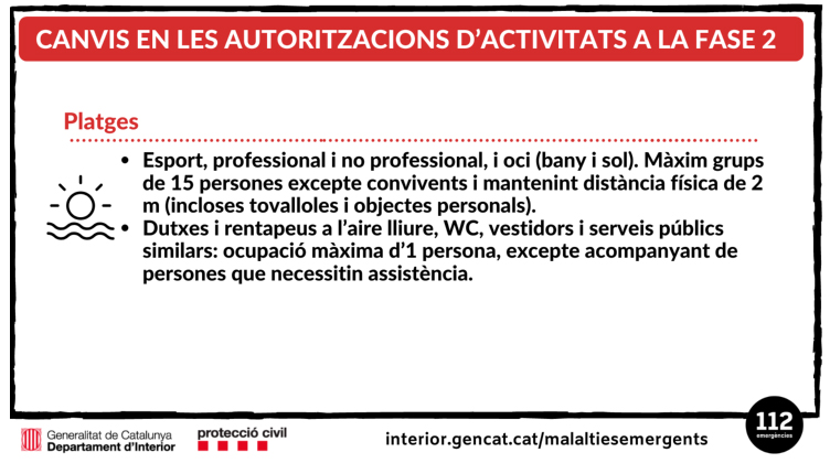 - Obertura de les platges per al bany d’oci i prendre el sol. A part de poder-hi practicar esport, amb la fase 2 es permetrà el bany recreatiu a les platges. La regulació, però, anirà a càrrec de cada municipi, i s’hauran de complir totes les mesures de seguretat i prevenció.