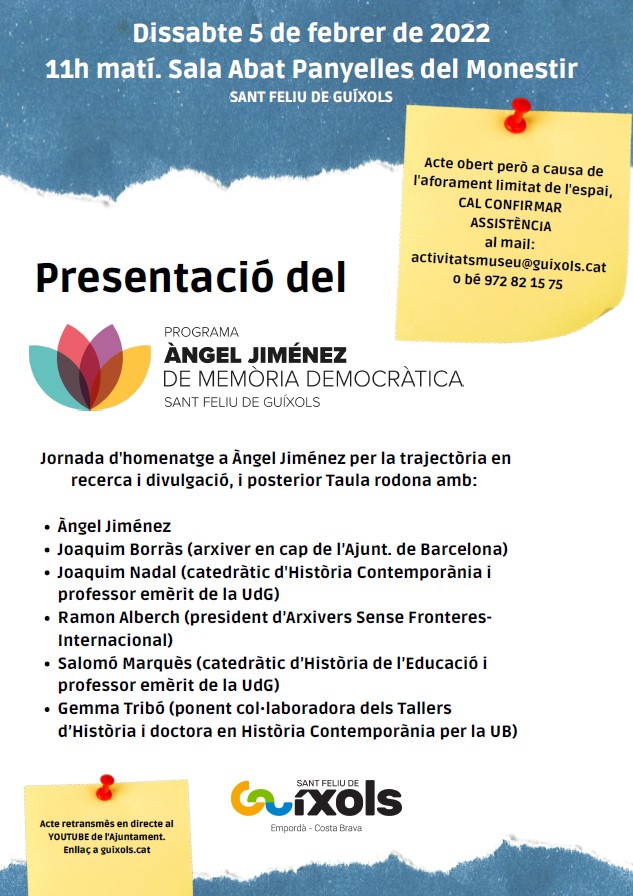 L’Ajuntament de Sant Feliu de Guíxols impulsarà properament un programa sobre memòria democràtica que portarà el nom d’Àngel Jiménez, qui va ser fins fa pocs anys arxiver i director del museu de l’Ajuntament guixolenc fins a la seva jubilació, en el seu paper, sobretot, com a pioner en la recerca i reparació de les víctimes de la repressió franquista.
