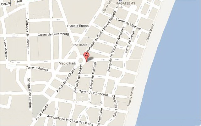 * La farmàcia Montserrat Sala es troba en ple giratori d’entrada a la població de Platja d’Aro, davant del Màgic Park. Cliqueu damunt del plànol per ampliar.