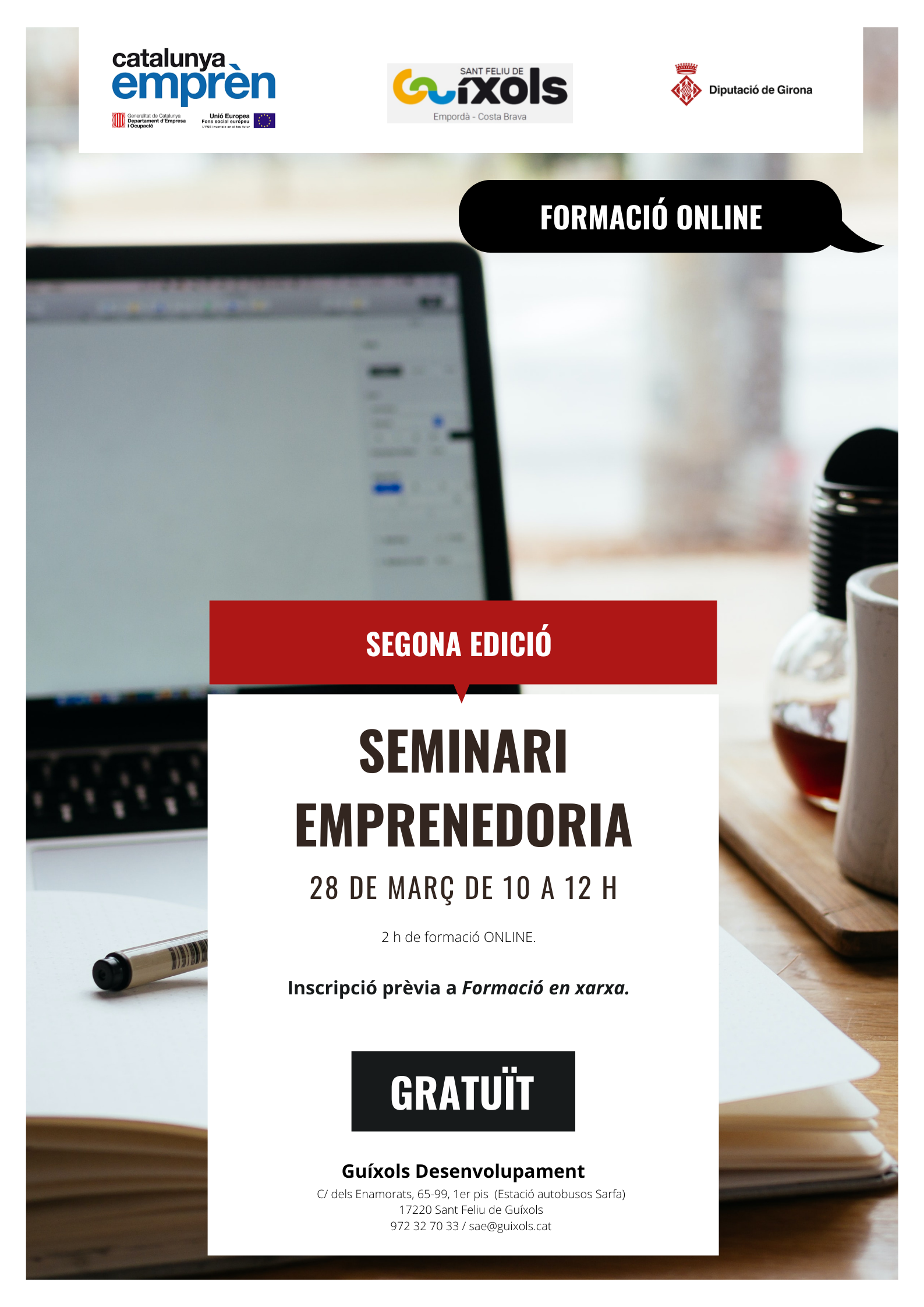 El Servei d’Assessorament d’Empreses de l’Ajuntament de Sant Feliu de Guíxols engega una formació online gratuïta dirigida a emprenedors, o persones que estiguin valorant la possibilitat d’emprendre, i que tindrà lloc el proper 28 de març.