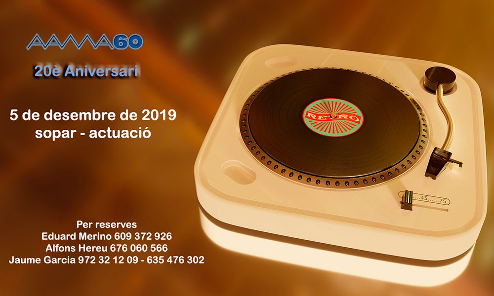 El dijous 5 de desembre és la data escollida per l'Associació d'Amics de la Música dels Anys 60 per celebrar els 20 anys. I es farà a amb un sopar al s'Agaró Hotel a les 21h. El preu és de 33€ pels socis i 38 pels no socis.