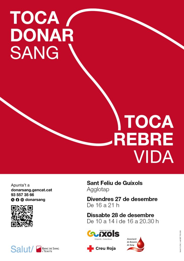 El divendres 27 i dissabte 28 de desembre, el Banc de Sang i Teixits ha organitzat una donació de sang que tindrà lloc a l’antiga Agglotap. Divendres s’hi podrà participar de 16 a 21 hores i dissabte, matí i tarda, de 10 a 14 i de 16 a 20.30 hores.