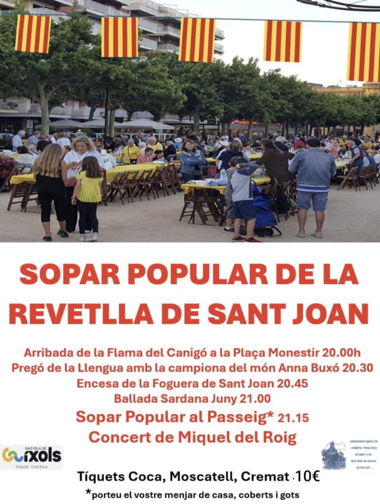 El sopar popular, que cadascú s’ha de portar, començarà cap a les 21.15 hores i durant la nit també hi haurà l’actuació de Miquel del Roig. Els assistents podran adquirir tiquets per a coca, moscatell i cremat al preu de 10 euros. L’activitat compta amb el suport de l’Ajuntament de Sant Feliu.