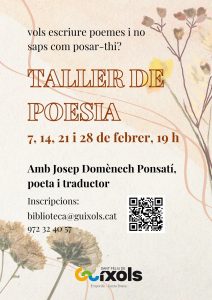 Els dies 7, 14, 21 i 28 de febrer a les 19,00h a la Biblioteca Pública Octavi Viader i Margarit de Sant Feliu de Guíxols es porta a terme un taller de poesia a càrrec de Josep Domènech Ponsatí, poeta i traductor.