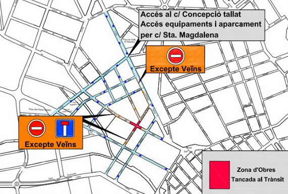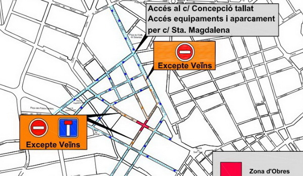 Degut a les obres d’elevació de la calçada a l’alçada de les voreres a l’encreuament entre els carrers Concepció i del Mall, el trànsit rodat pel carrer del Mall entre els carrers Llibertat i Mercè, i pel carrer Concepció entre els carrers Capmany i Joan Surís, quedarà temoralment tancat i serà només accessible als veïns.