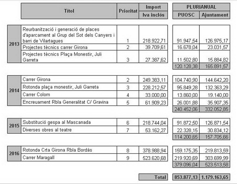 D’altra banda, fa uns dies que publicàvem la proposta amb 9 projectes que l’Ajuntament aprovava en el Ple i que presenta al Pla Únic d’Obres i Serveis de Catalunya (PUOSC) i avui annexem un document on es poden comprovar els costos que representaran. La regidora d’Obres Públiques de l’Ajuntament, Dolors Ligero, ha confirmat a aquesta emissora que l’àrea d’Urbanisme ja està treballant en els projectes programats pel 2013 per tal de començar les obres tant punt rebin la confirmació de la Generalitat.