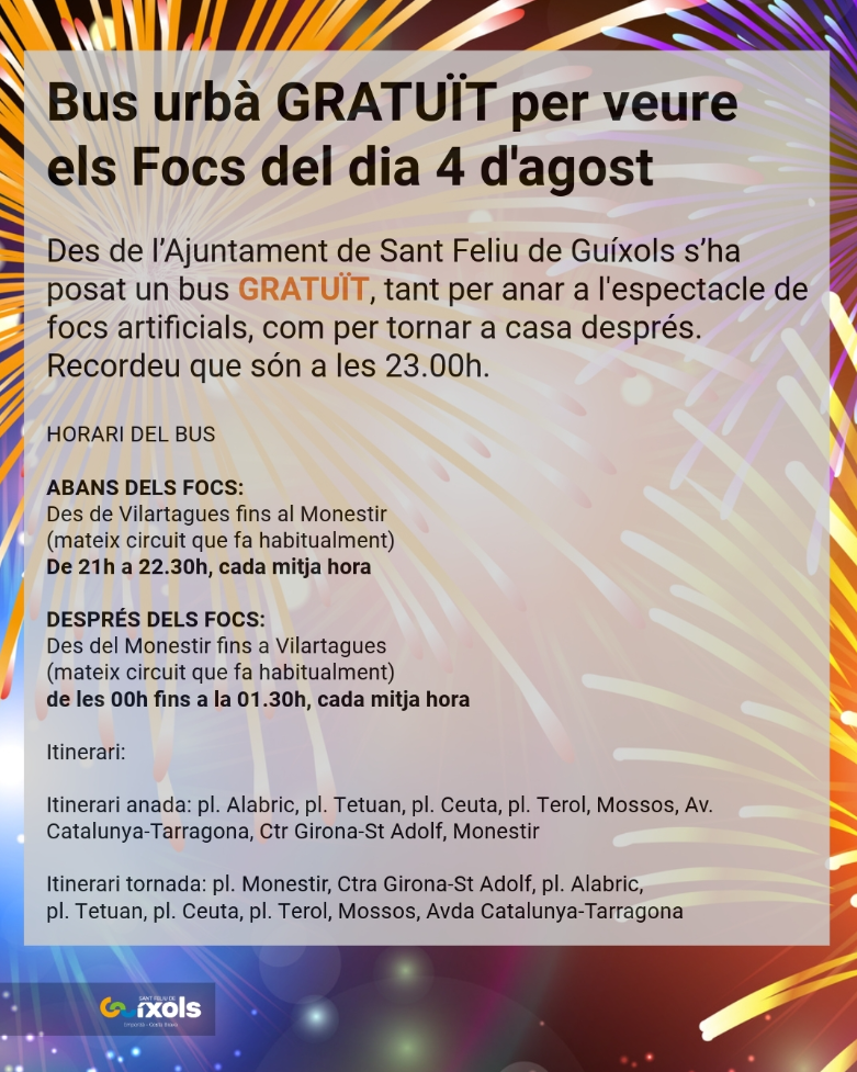 D’altra banda, l’Ajuntament posarà a disposició de la ciutadania el bus urbà gratuït per anar a veure els focs del 4 d’agost. A la imatge d’aquí sota podeu consultar els horaris i recorreguts.