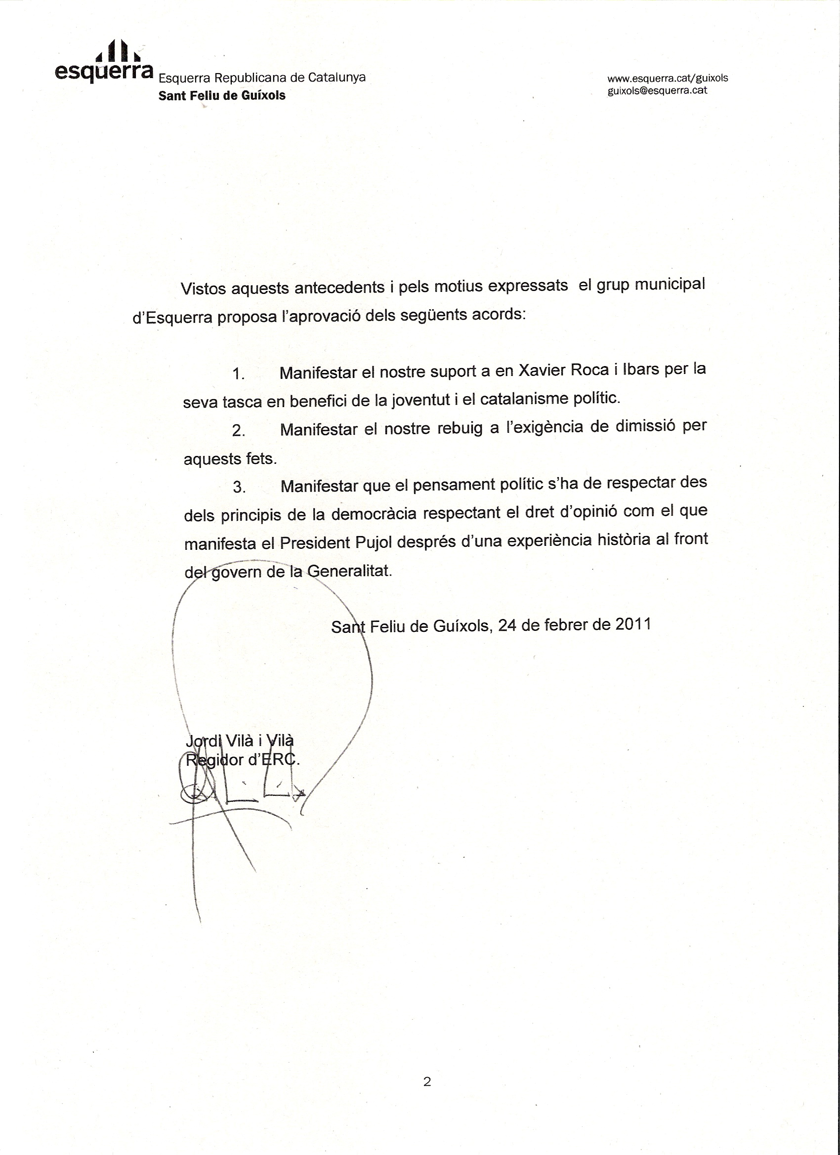 El guixolenc Xavi Roca va rebre dijous el suport personal i unànime del Ple de Sant Feliu després de ser cessat com a president d’Unió de Joves de les Comarques Gironines (moviment juvenil pertanyent a Unió Democràtica de Catalunya) en defensar l’independentisme i després d’enviar una carta de reconeixement i felicitació a l’ex-president de la Generalitat, Jordi Pujol, per contemplar la via de la independència de Catalunya en els seus plantejaments actuals.