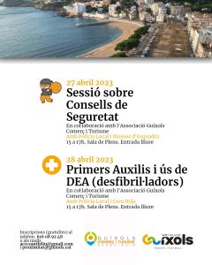 Aquesta propera setmana, l’Associació Guíxols Comerç i Turisme i l’Ajuntament han organitzat dues xerrades especialment dissenyades per a professionals, però alhora oberta a tothom, per tal de repassar consells de seguretat i nocions bàsiques de primers auxilis. La primera de les xerrades es preveu pel dijous dia 27 per parlar sobre consells de seguretat amb la col·laboració de la Policia Local i dels Mossos d’Esquadra.