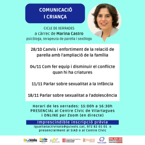 Serà els divendres 28 d’octubre, 4, 11 i 18 de novembre de 15:00 a 16:30 h., al centre Cívic Vilartagues (presencialment) i online per zoom (en directe). Es fa a través del cicle “Comunicació i criança” i aniran a càrrec de Marina Castro, psicòloga, terapeuta de parella i sexòloga.